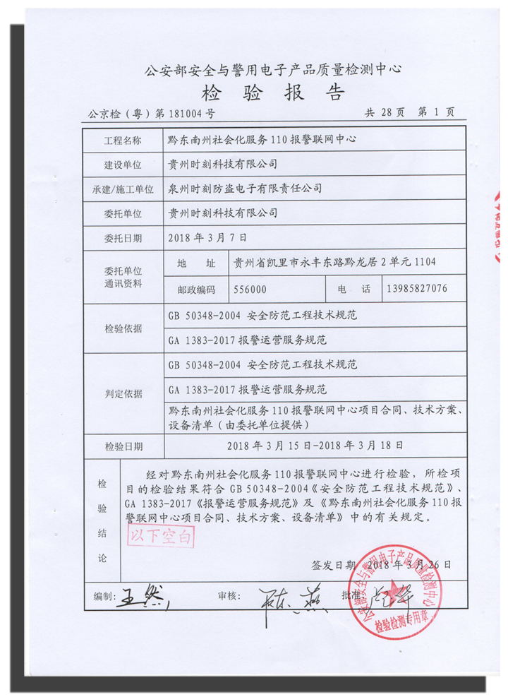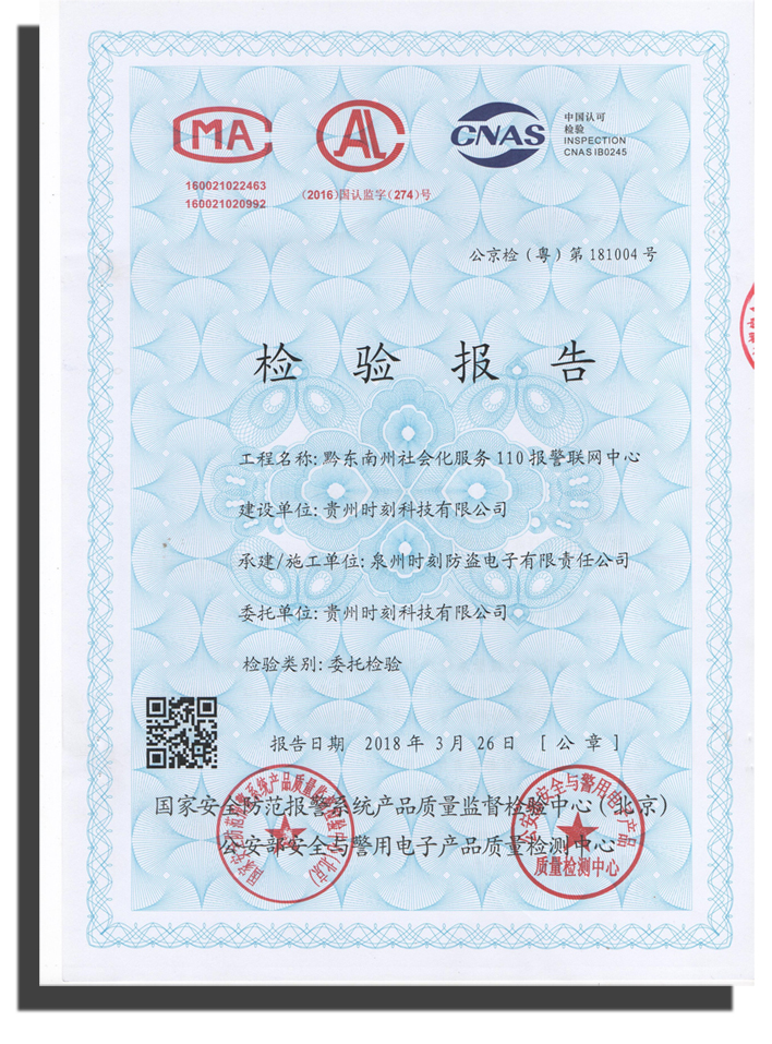 2018年3月,我司“承建黔東南州社會(huì)化服務(wù)110報(bào)警聯(lián)網(wǎng)中心”通過(guò)“國(guó)家安全防范系統(tǒng)產(chǎn)品質(zhì)量監(jiān)督檢驗(yàn)中心”和“公安部安全與警用電子產(chǎn)品質(zhì)量檢測(cè)中心”檢驗(yàn)并獲得證書(shū)。
